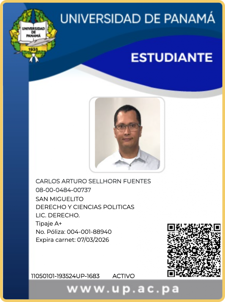 The following ID is from Carlos Arturo Sellhorn Fuentes, an Universidad de Panamá (University of Panama) student. You can access the official website of the university at: https://up.ac.pa/
